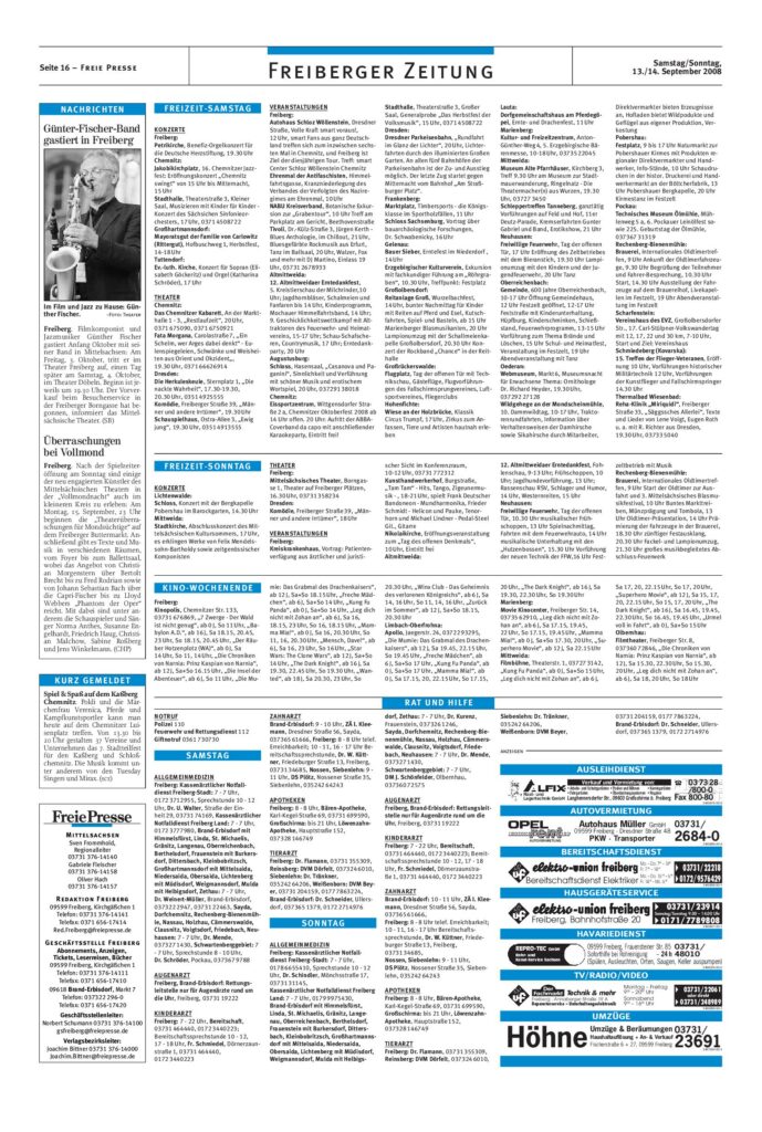 Theater: Vollmondnacht & Jazzmusiker Günther Fischer (13.09.08) & Anderes Quelle: Freie Presse Archiv – Lokalausgabe 13.09.2008 13.09.08