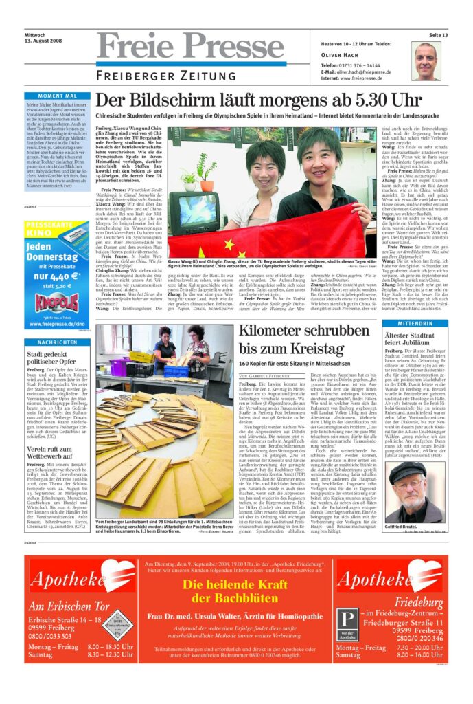 Chinesische Studierende in Freiberg & Anderes Quelle: Freie Presse Archiv – Lokalausgabe 13.08.2008 13.08.08